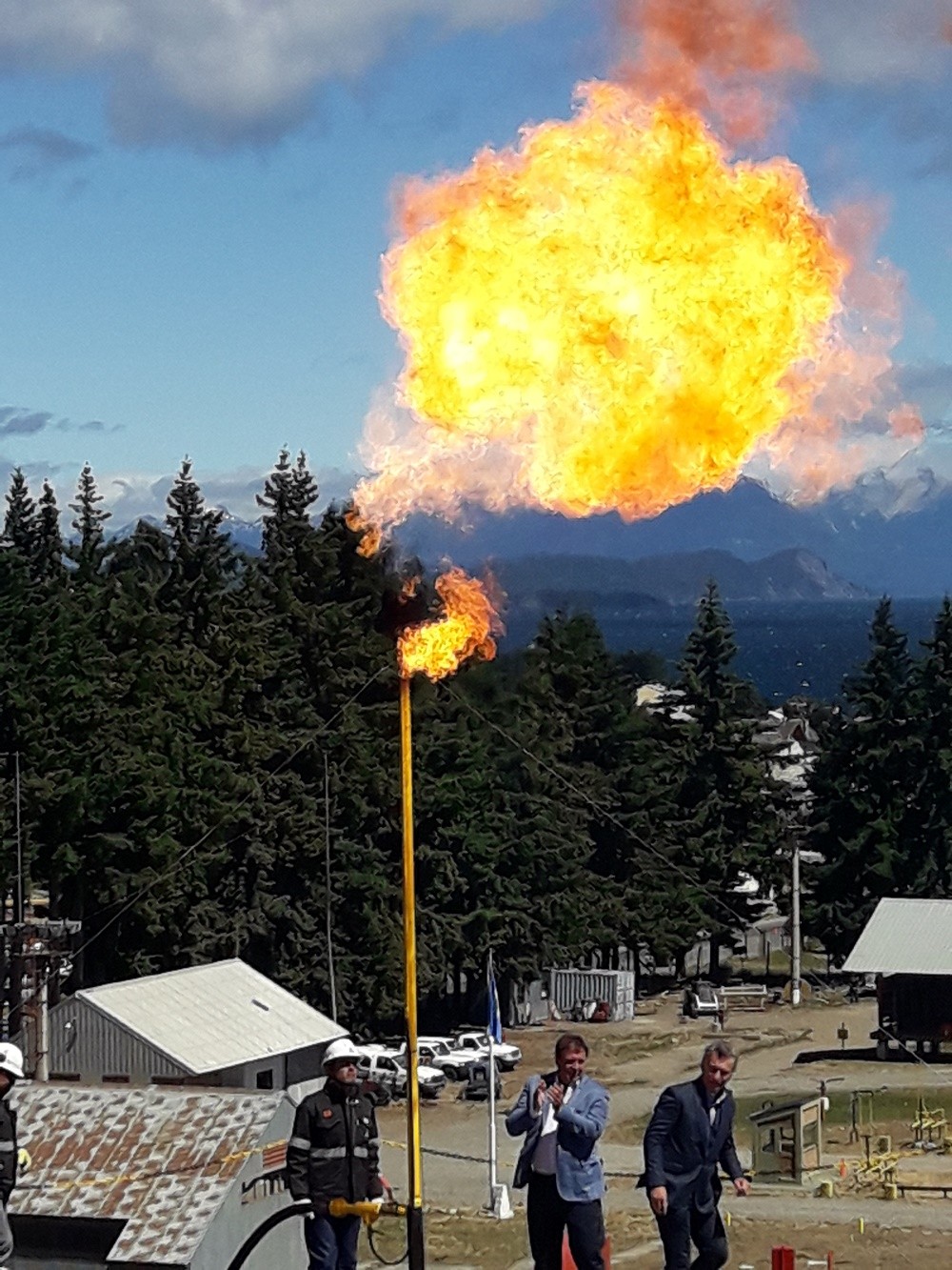 Antes de volver a abordar el helicóptero que lo trasladaría de regreso a Villa la Angostura (aunque algunas versiones indicaron que previamente pasaría por el Hotel Llao Llao para continuar temas de la cocina política), el Presidente, junto al Gobernador, al Presidente de Camuzzi y a operarios de la planta de gas, encendieron una llama simbólica para dejar inaugurado el Gasoducto Cordillerano. El viento y la explosión lógica del fluído al entrar en combustión, parecieron generarle al Presidente algo de intranquilidad. Agachado y rápidamente alejándose del sector, emprendió su partida. Lo aguardaba su descanso interrumpido…