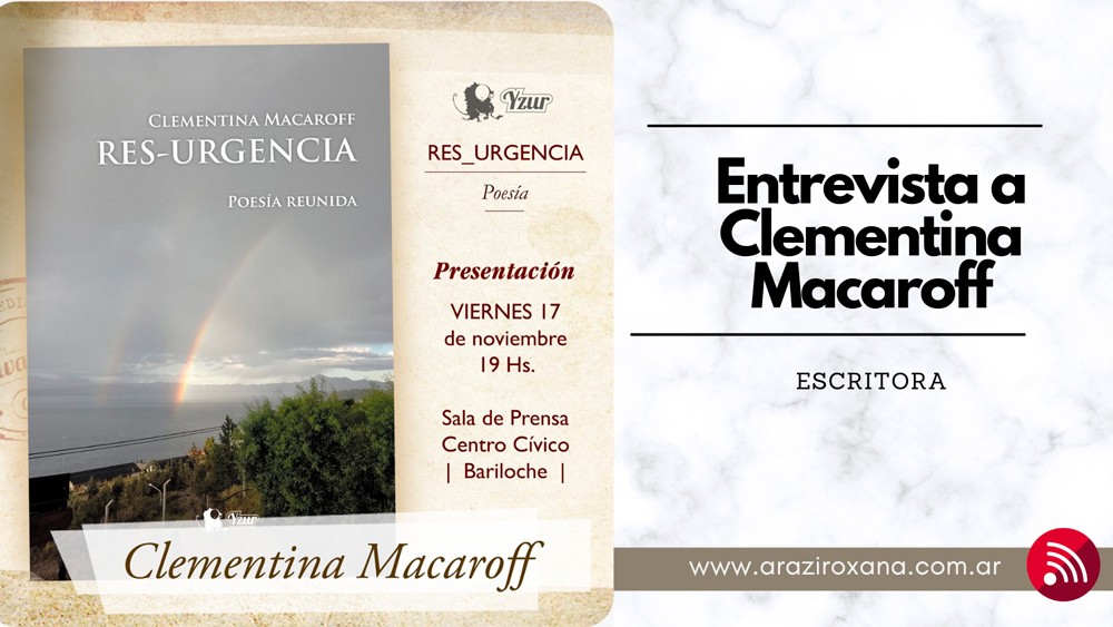 Clementina Macaroff presenta su último libro “RES-URGENCIA” poesía reunida, una compilación de poemas que recorren etapas de “resistencia, de soledades, de amores y otras hierbas”. Será este viernes 17 de noviembre 2023, a las 19 horas, en la Sala de Prensa del Centro Cívico (Bariloche), con entrada libre y gratuita. En esta entrevista, hablamos sobre los temas que la inspiran, los motivos, y también del contenido de su nueva obra. Escuchar acá: