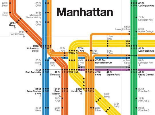 La red de metro de New York tiene 28 líneas que conectan los distritos de Manhattan, Brooklyn, Queens y Bronx, y a lo largo de esas líneas hay 425 estaciones y más de 1000 km de vías. Comenzó a funcionar en 1904, pero su crecimiento hizo cada vez más compleja la información para el público usuario.