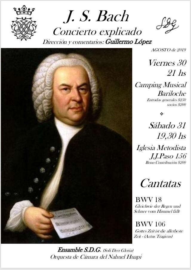 En esta reedición de los “Conciertos Explicados” se presentarán las Cantatas: BWV 18 (Así como la lluvia y la nieve caen desde el cielo) y BWV 106 (Actus Tragicus), junto al Ensamble S.D.G. (Soli Deo Gloria) y la Orquesta de Cámara del Nahuel Huapi.