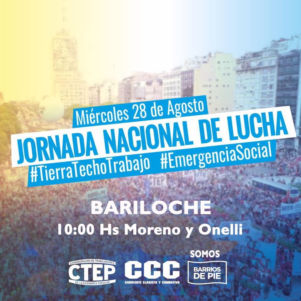 Ante la gravedad de la situación de las familias que se dedican a la economía popular, CTEP (Confederación de Trabajadores de la Economía Popular), CCC (Corriente Clasista y Combativa) y Barrios de Pie invitan en Bariloche a acompañar el reclamo partiendo a las 10 de la mañana desde Moreno y Onelli para marchar hasta Mitre y Villegas, donde realizarán concentración y lectura de documentos.
